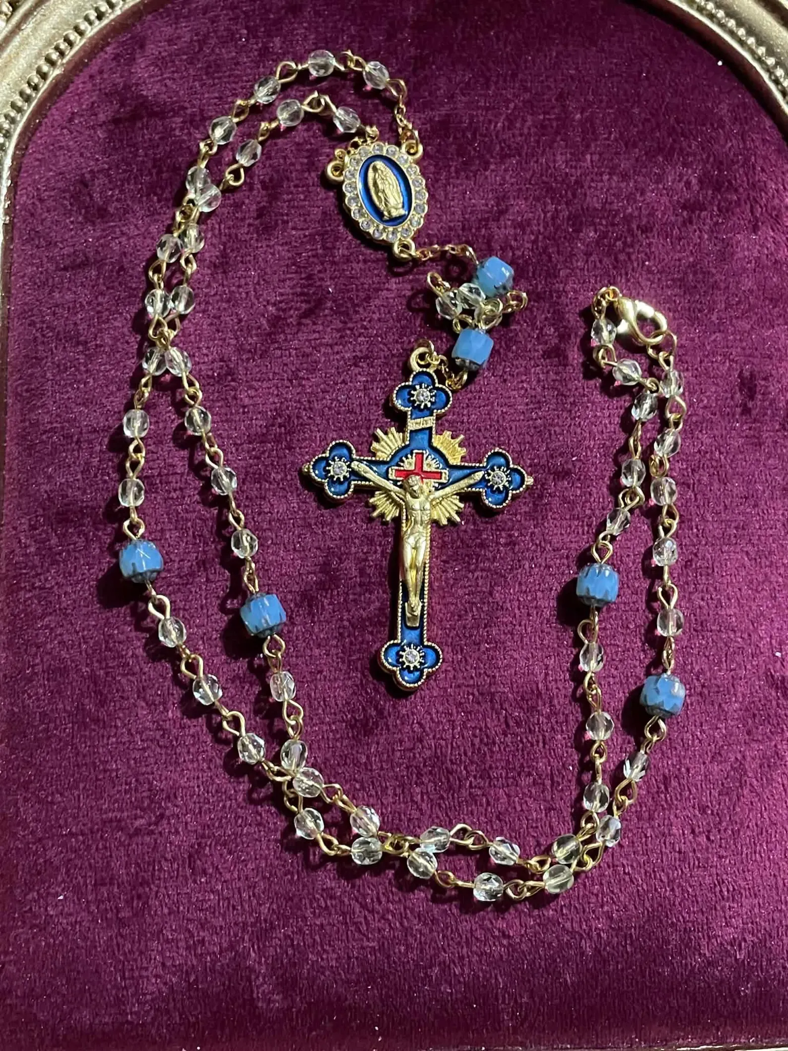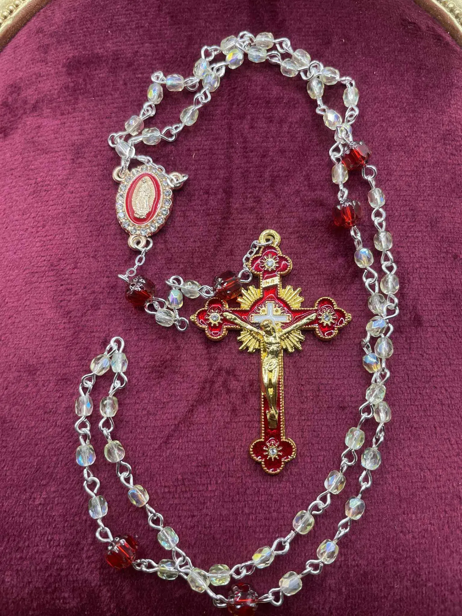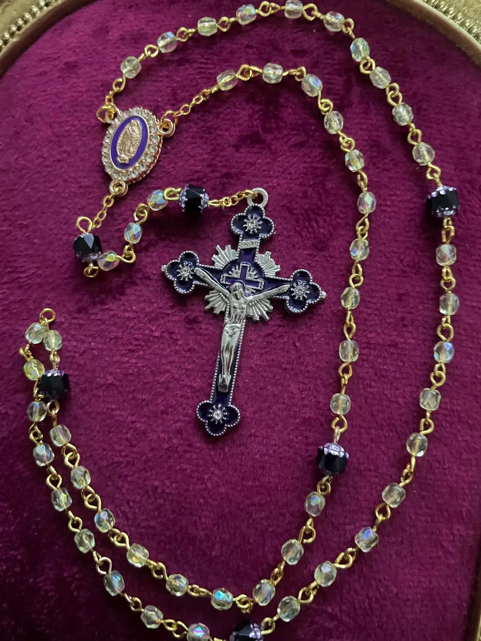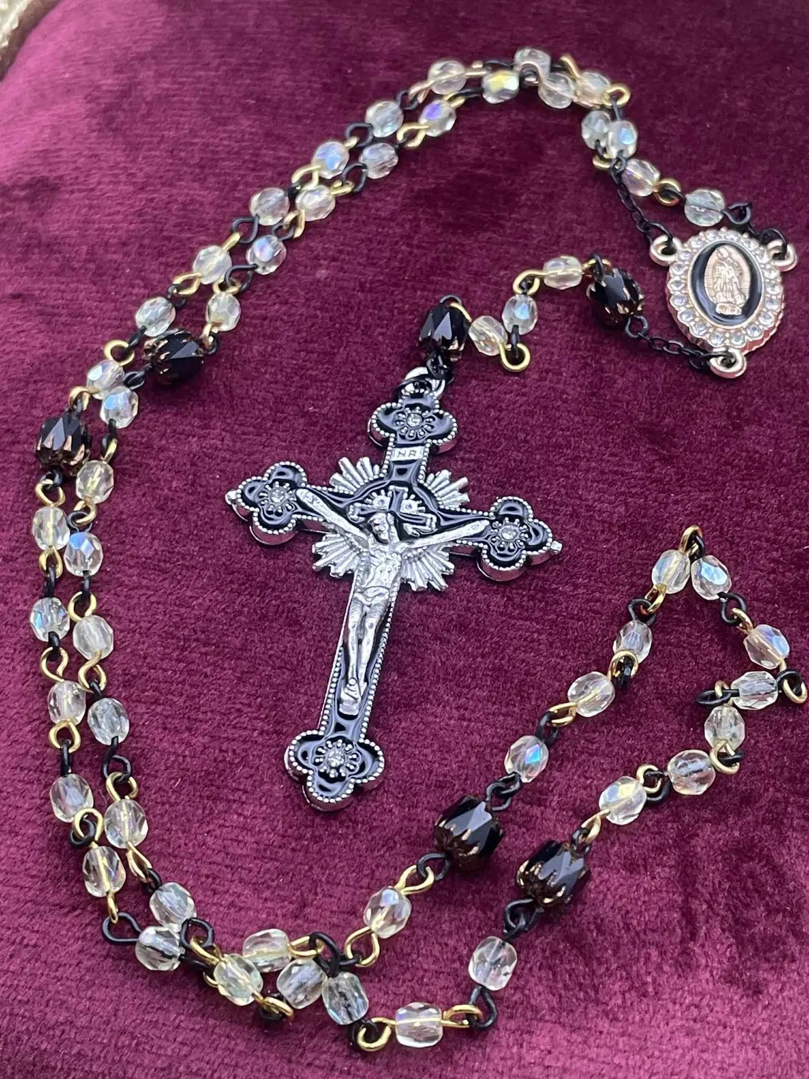 I’ve designed these so the crucifix always matches the color of the 6 Cathedral beads. Here is how they break down:
